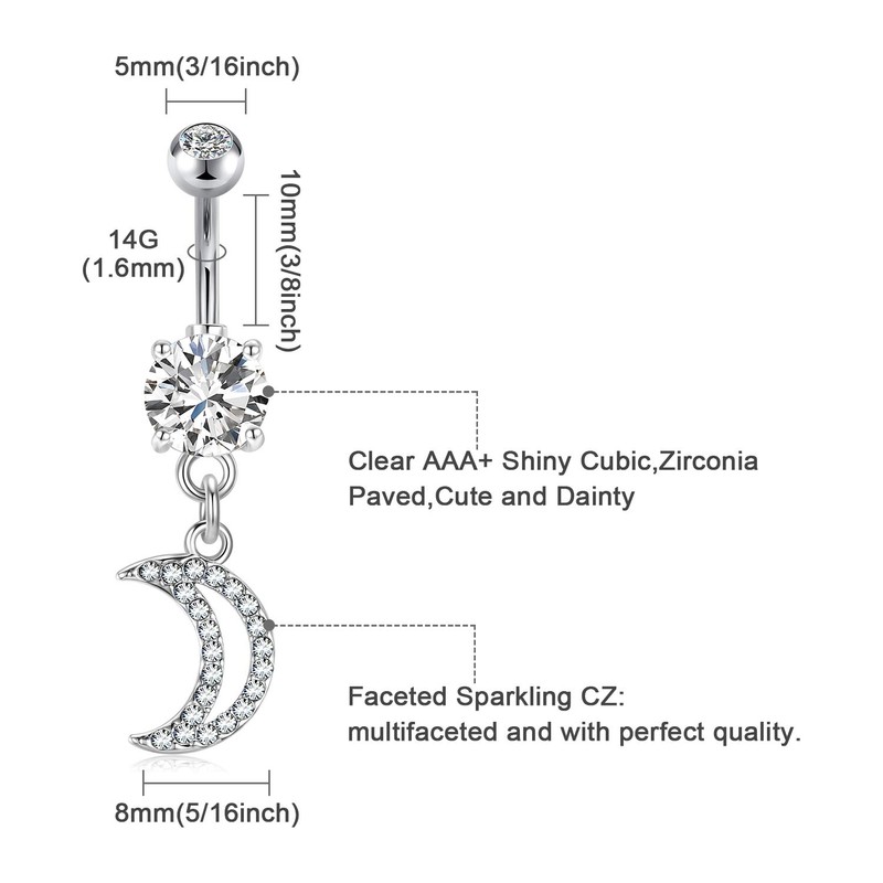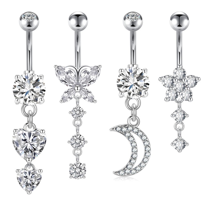 - Silver belly button piercing set: 4 pieces dangling belly button bars in different styles. With sparkling clear gemstones shine brightly on these long belly bars.