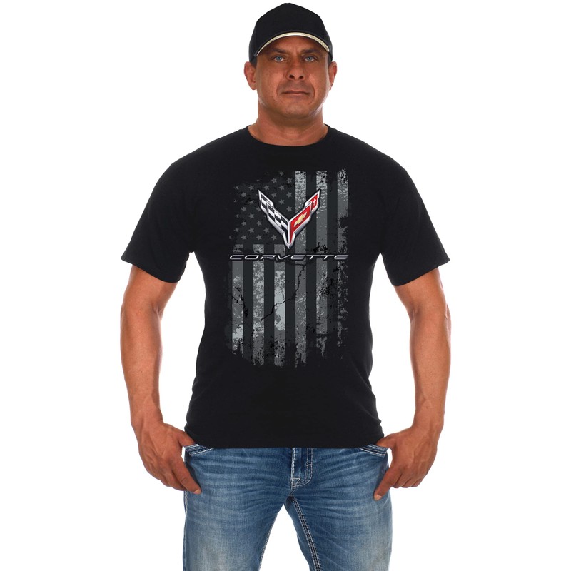 - Officially Genuine Chevy Corvette T-shirt: keep it simple, subtle and classic! Designed to excellence, this men’s T shirt by JH Design features Chevy Corvette Emblem & Distressed American Flag design embellishment on the front to portray your love for speed and patriotism Get in your Chevy Corvette and look good in this car t shirt. Also check out our other Corvette t shirts, Corvette hoodies, Corvette jackets, and Corvette hats!