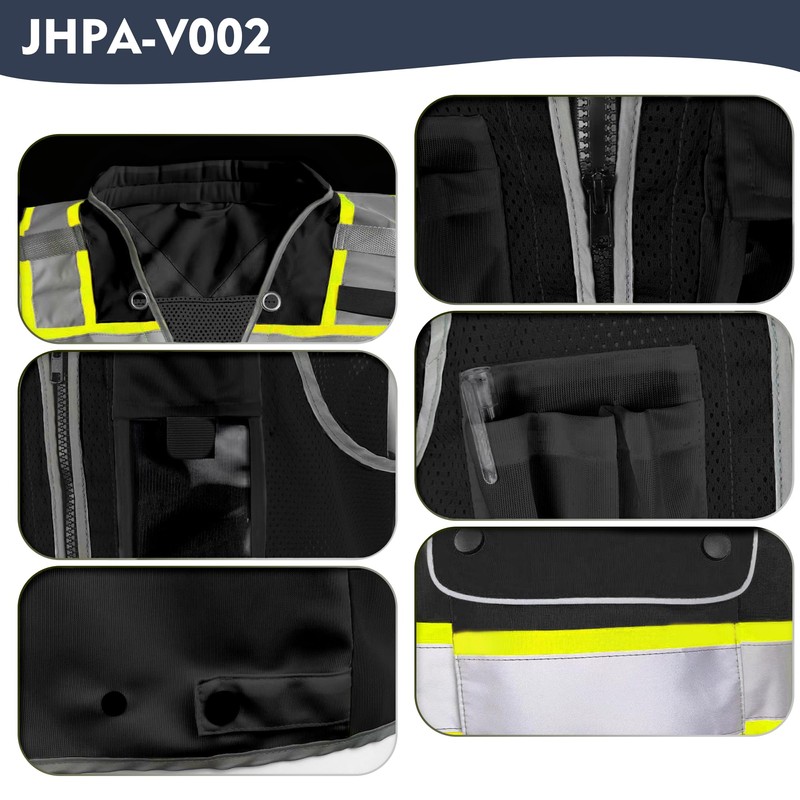- COMFORTABLE AND BREATHABLE FABRIC: The work vest JHPA-V002 is made of 100% polyester mesh and knitting.The fabric in black on the front bottom enhances color contrast while hiding grease and dirt, keeping the reflective vest appearance clean and professional. Most of the fluorescent fabric of the security vest are clearly visible in the sun, and the reflective strips makes the vest visible at night.