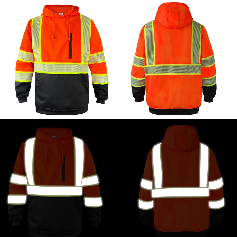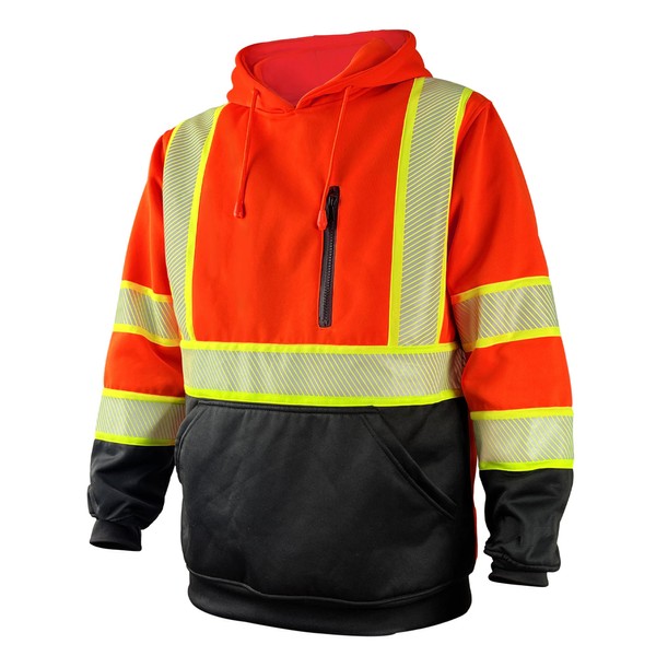 - DESIGN: The cuffs and hem of reflective hoodie for men are threaded for durable and breathability, allowing you more freedom of movement. Adjustable drawcord permanent hood protects the head and neck to keep you warm when working in cold weather. High visibility lightweight pull-on orange-black yellow-black hoodie with a chest zippered pocket brings more convenient for you.