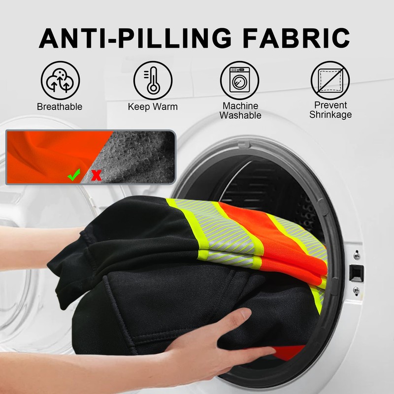 - COMFORTABLE AND WARM FABRIC: The class 3 safety sweatshirt with pockets is made of 100% polyester fleece knitted material (NOT FR),which is durable, warmth comfort and pilling resistant. The safety hoodie with black bottom is not easy to get dirty and easier to match.