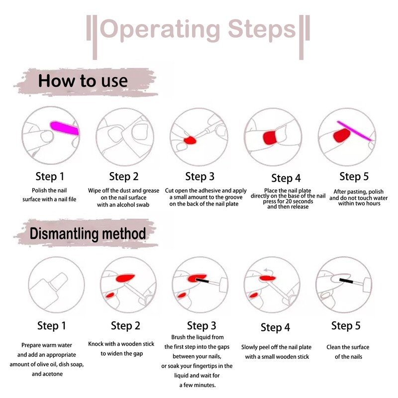 - IMPORTANT NOTE: The kit includes adhesive tabs and nail glue. You may choose either one to apply your nails. Adhesive tabs are easy to remove, while nail glue offers longer wear. If you apply nails with glue, they are not recommended for reuse.