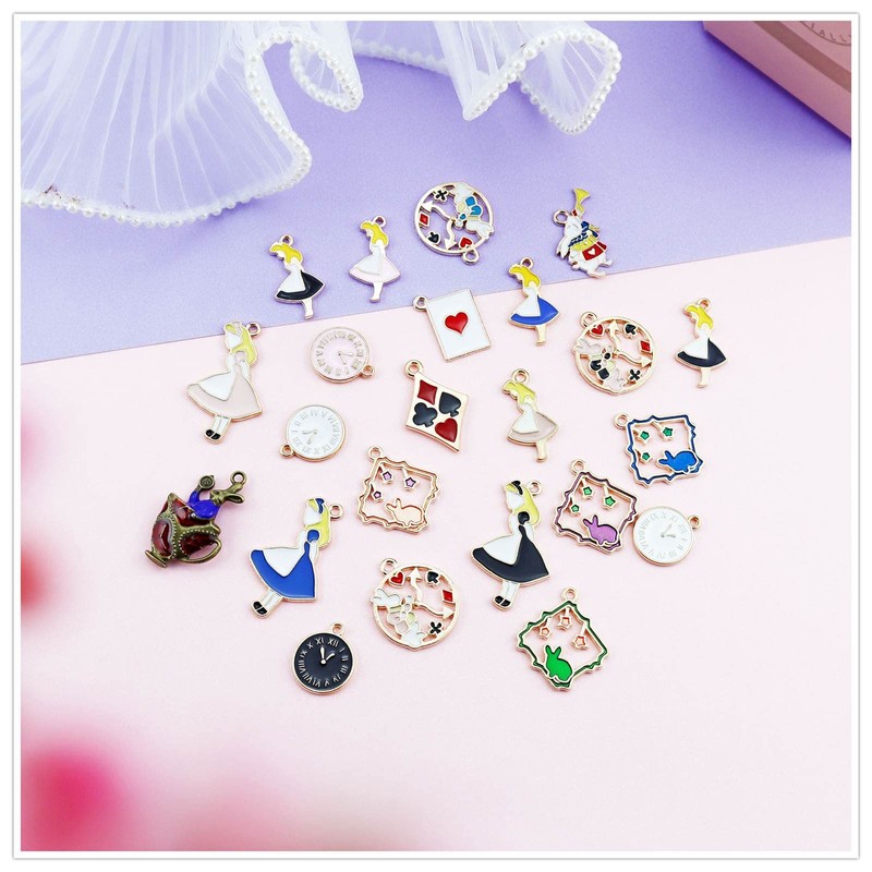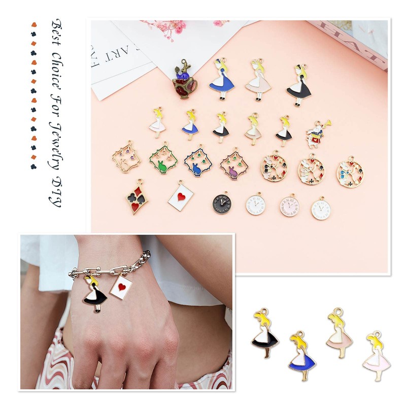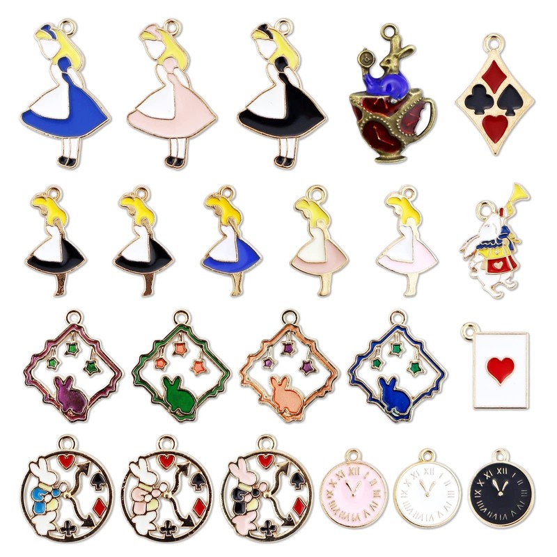 - Cantidad: 19 unidades. 19 tipos de color dorado esmaltado, una pieza de bronce antiguo esmaltado como se muestra en la imagen. Dijes mixtos con temática de Alice, incluye tarjetas de juego de reloj de conejo Alice Girl, adecuados para tus diferentes necesidades para manualidades de bricolaje.