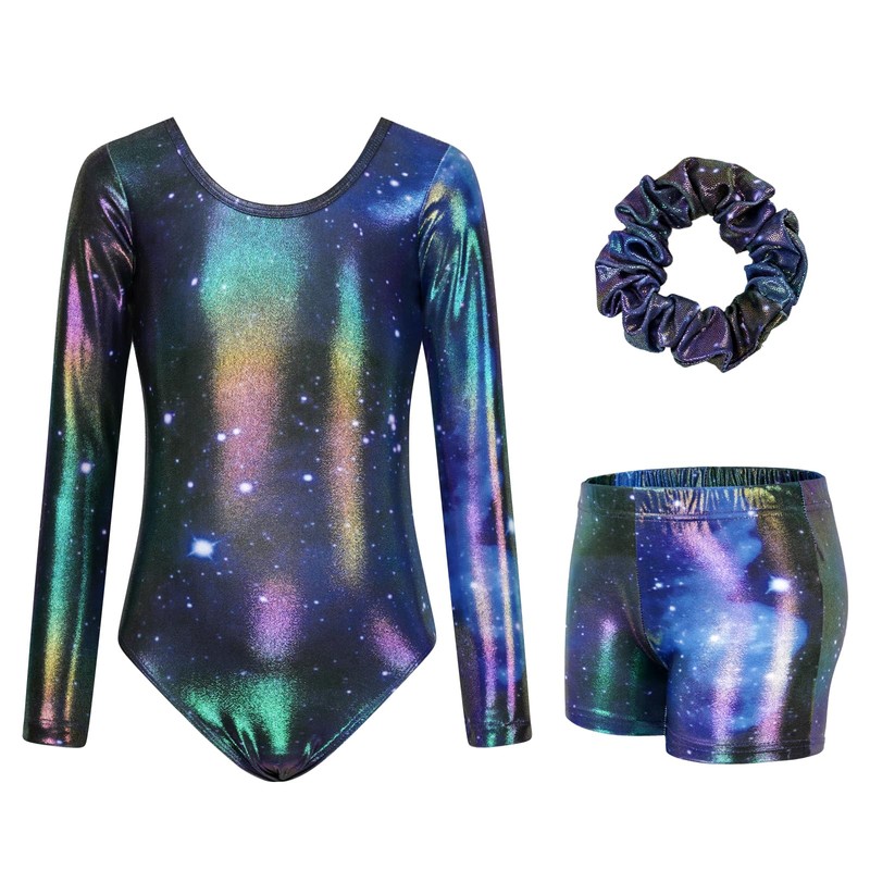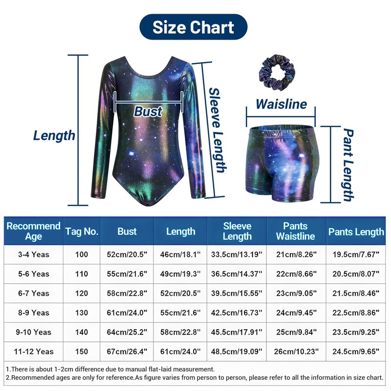 • 3 Pcs Set of Leotards Girl gymnastics leotard set contains a professional dance ballet leotard with shorts and hair scrunchies, designed for girls aged 3-12 years old, provide great coverage for freer movement.