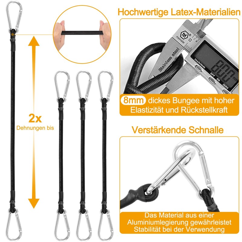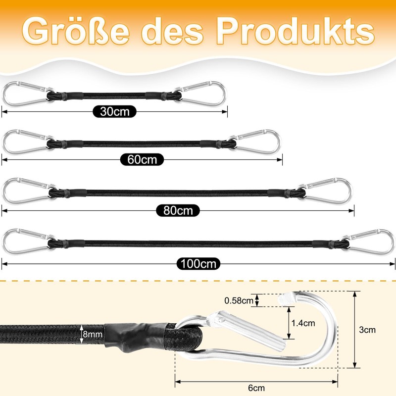 - MULTIPLE LENGTH We offer our rubber rope with carabiner in different lengths to meet different demands. Whether you need to securely fix small items or transport larger loads, you will always find the right tension rope for your needs. Our high-quality elastic straps with hooks and make it easier to transport your load