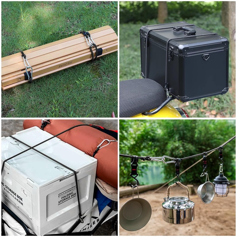 - MULTIPURPOSE Our rubber tensioner with hook is versatile and suitable for a variety of uses. Use it to secure your cargo on the car or transport trailer, to hold bulky items in the boot or to bundle your camping gear. This elastic strap with carabiner is indispensable in the home, camping or outdoor activities