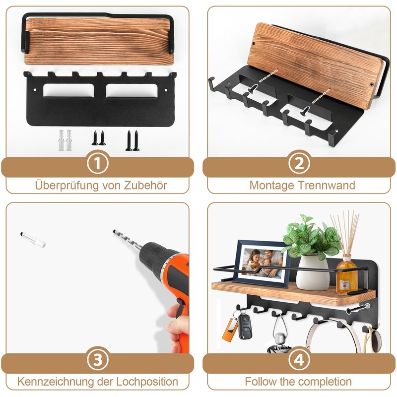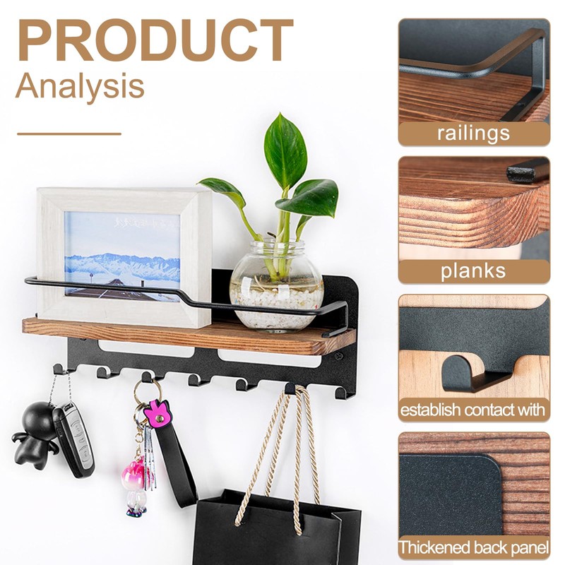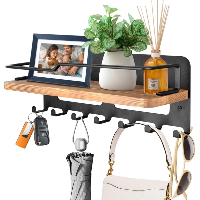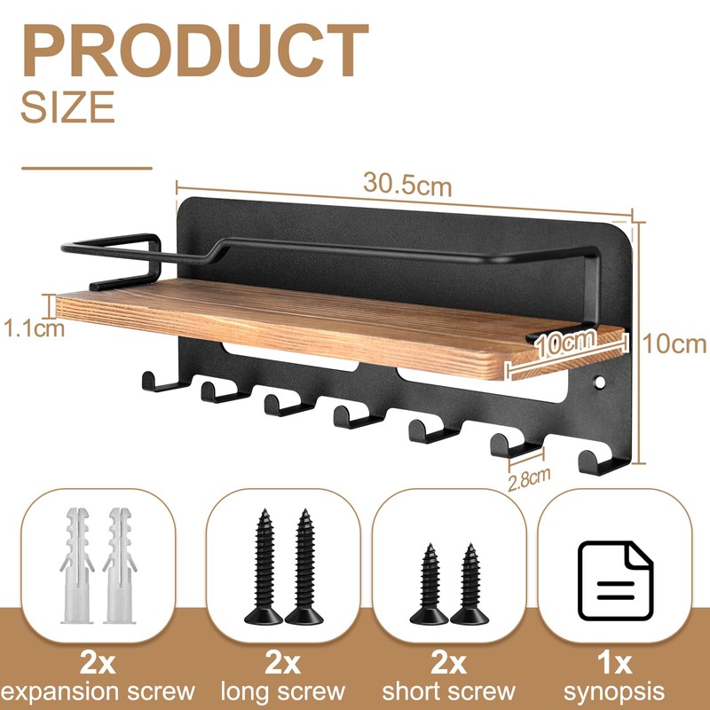 - Multifunctional shelves: the wooden wall shelf for key holder organiser allows you to effectively use the wall space to meet your decoration and storage needs. The key rack for the wall with 7 key hooks helps hang and organise keys, wallets, umbrella, bag, e-mail, dog lead, jackets and other small items in the entrance, front door, hallway, office