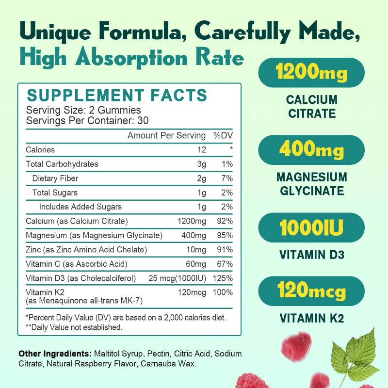 DELICIOUS AND CONVENIENT: Our calcium citrate gummies have a pleasant raspberry flavor and are easy to chew, making them a delicious snack. All ingredients are carefully formulated without adding unnecessary ingredients to avoid affecting calcium absorption, ensuring that your body gets the essential nutrients it needs, and are a pleasant way to support bone health and overall health.