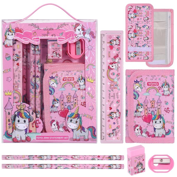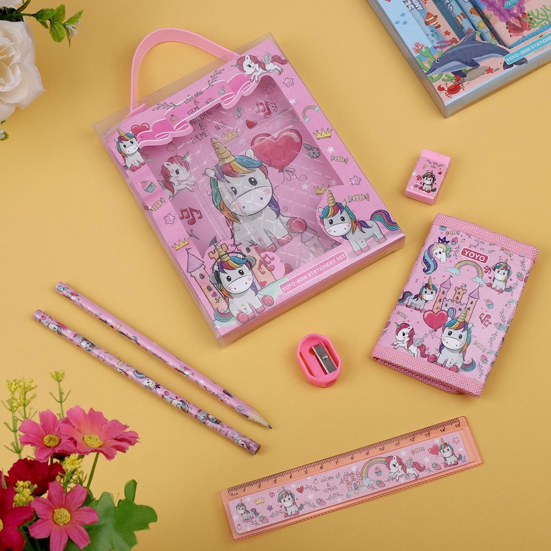 JIANTA Unicorn Stationery Set, 6-Piece Unicorn Pen Set for Girls, Eraser, Sharpener, Wallet, Ruler, Pencil, Children's Party Bag, Gift Set for Girls and Boys