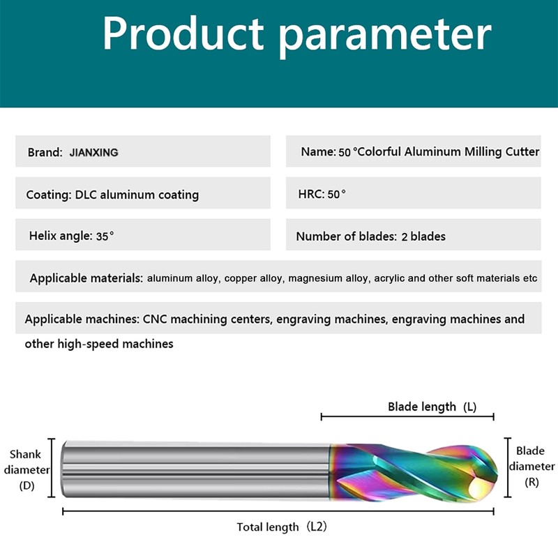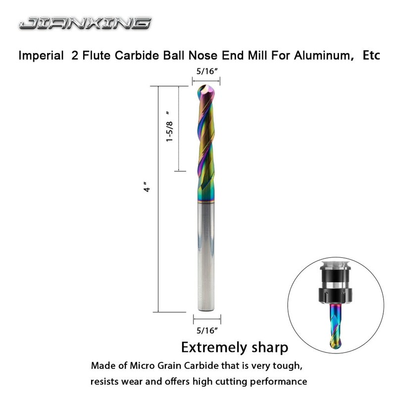 JIANXING 5/16" Extra Long DLC Coated 2-Flute Carbide Ball Nose End Mill, 4" Overall Length,Ideal for Aluminum, Copper Alloys & Plastic Machining–High Precision & Wear-Resistant Cutting Tool (1 Piece)