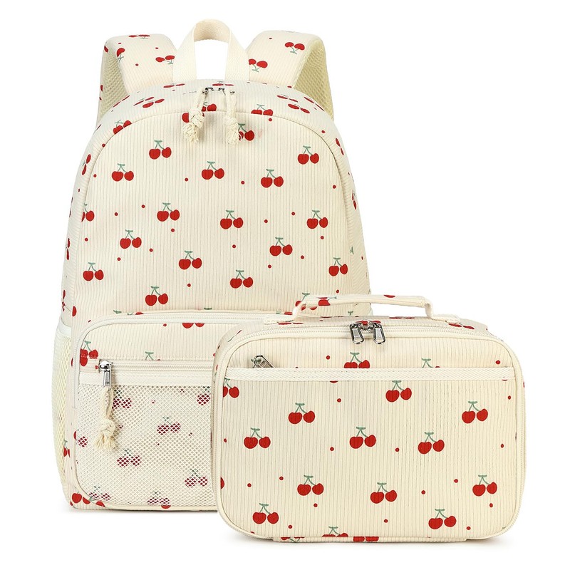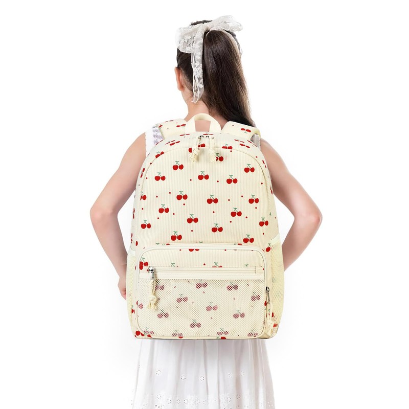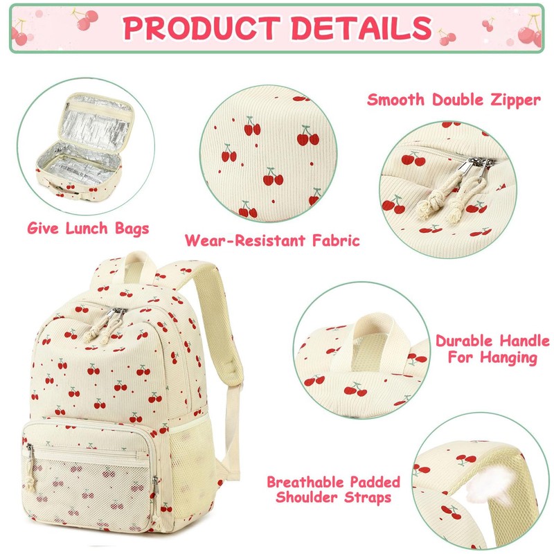 JIANYA Kids Backpack for Girls, Lightweight Kids Bookbag with Lunch Box, Elementary School Bag Set, Cherry Beige