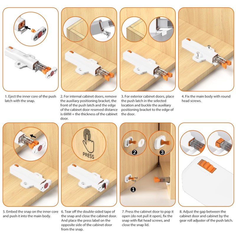 - Easy to install: This push latch integrated molding, only the two sides of the screw to fix, and the plat of latches come with adhesive, make the position and installation so much easier. No need to disassemble to adjust, adjust 0 - 6mm to fit different door gap size by dialing through the gear key. Whether you're a DIY enthusiast or a professional carpenter, this cabinet push latch is incredibly easy to install.