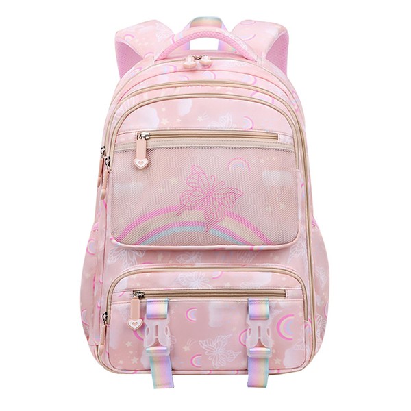 JiaYou Primary School Backpack Girls Elementary Daypack Butterfly Rainbow Pattern Bookbag(Pink Yellow,25 Liters)