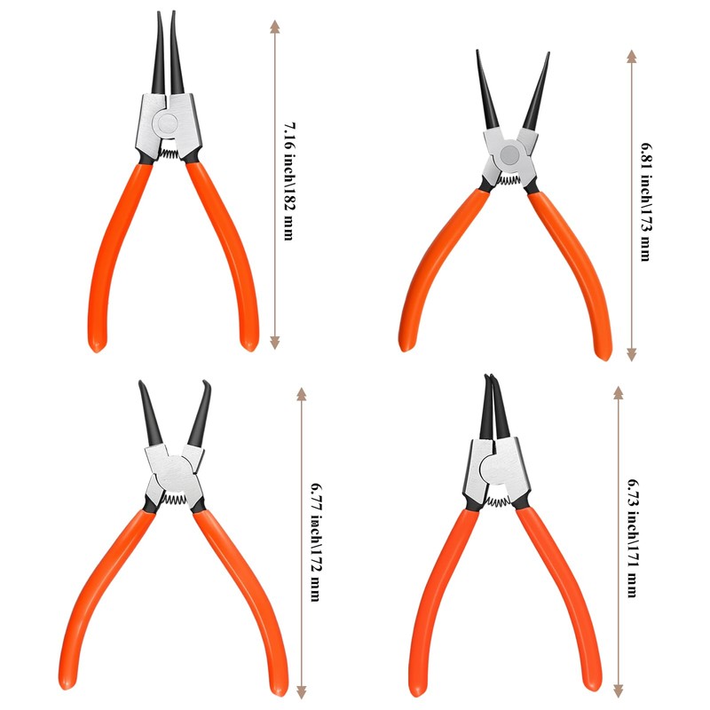 - SIZE: The dimensions of the circlip pliers are 173mm for straight inner pliers, 182mm for straight external pliers, 172mm for bent internal pliers, and 171mm for bent external pliers