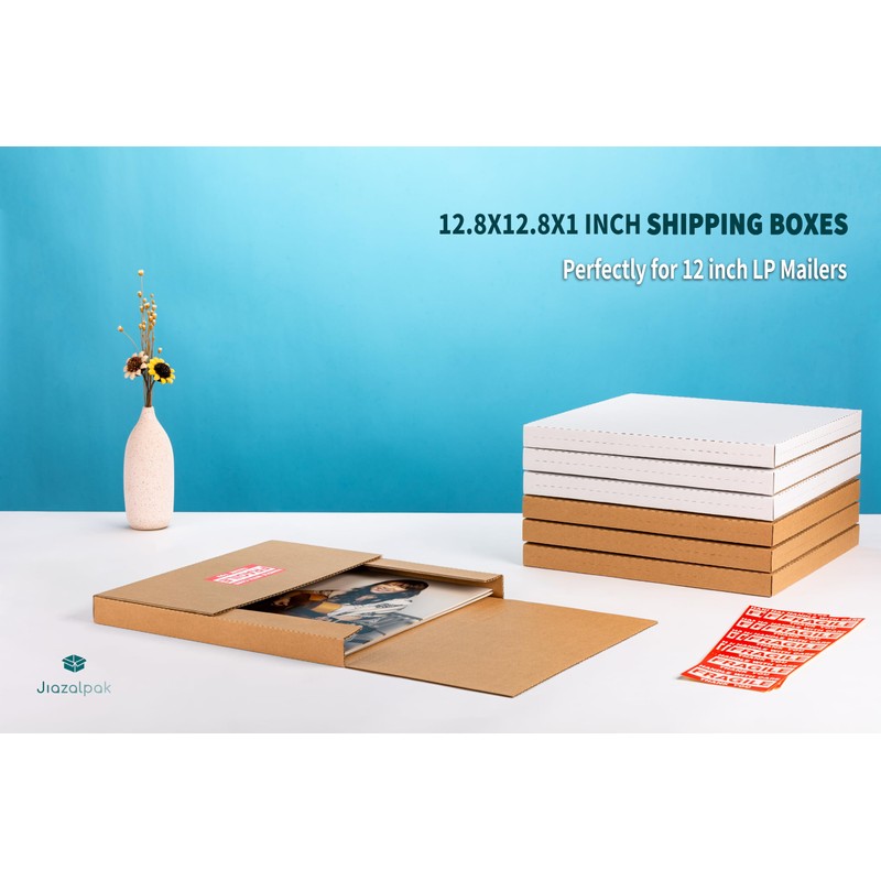 Jiazalpak Vinyl Record Shipping Boxes, 12.8"L x 12.8"W x 1"D, Easy-Fold, Multi-Depth LP Mailers with Fragile Stickers, Brown, 20 Pack