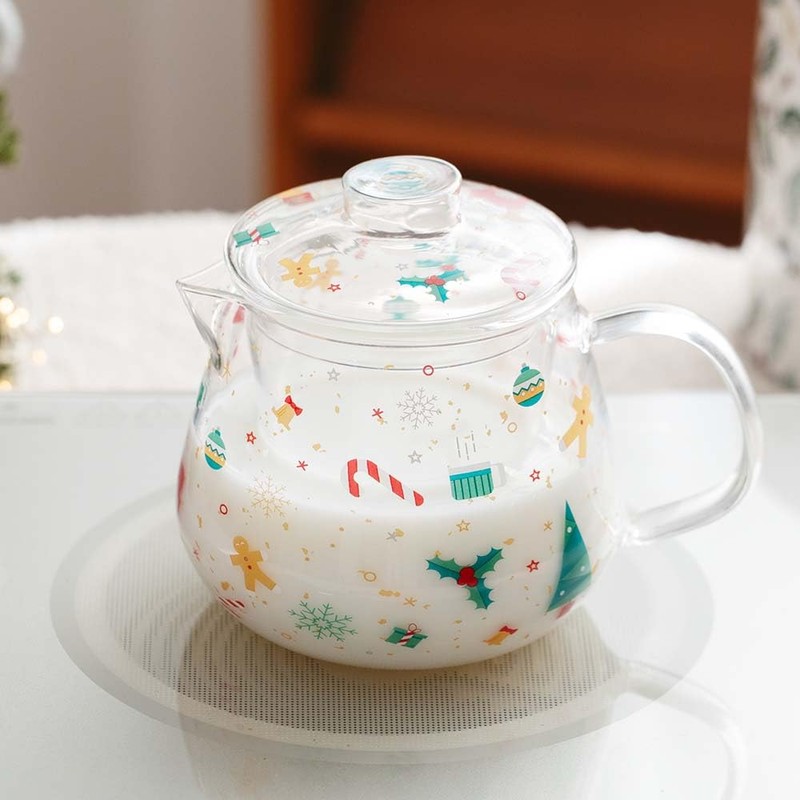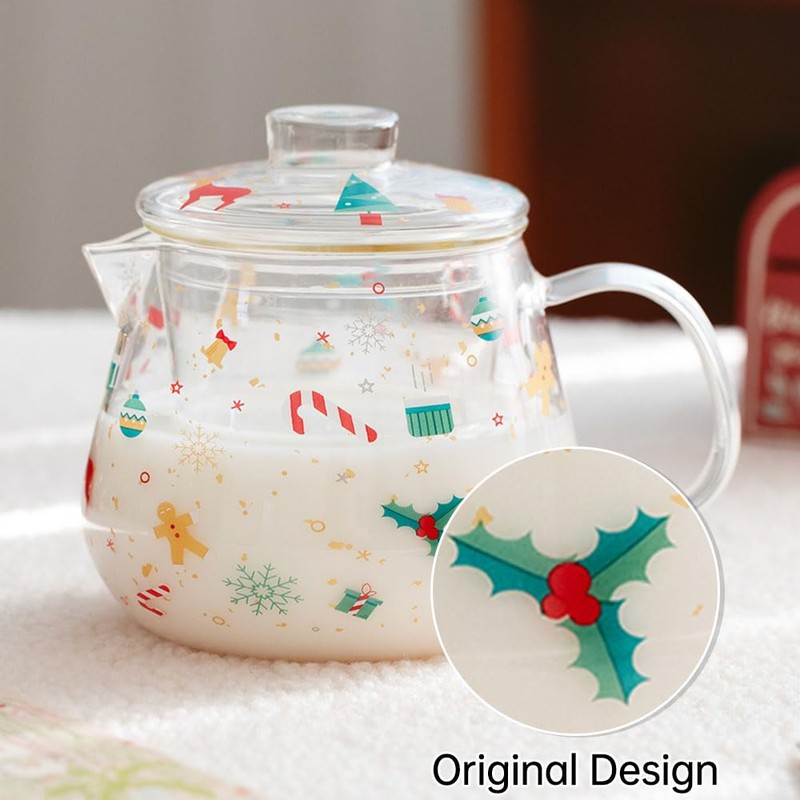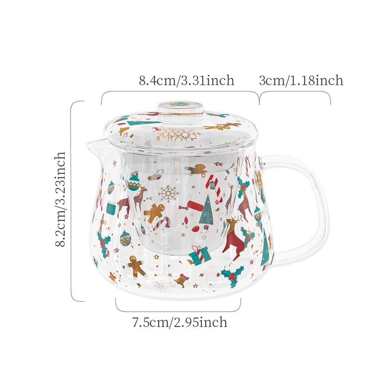 JIDOC 500ml/16.94oz Christmas Glass Teapot,Borosilicate Tea Kettle with Removable Glass Infuser(Happy A- Low)