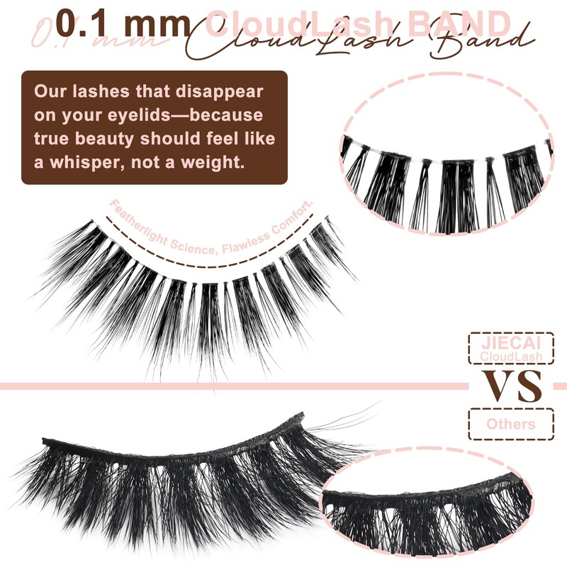 JIECAI CloudLash: Where Invisible Comfort Meets Unapologetic Glam Imagine this: Lashes so light, you forget they’re there—until strangers ask, “Are those yours?” Meet CloudLash: engineered for women who refuse to choose between comfort and beauty. The Science of Effortless Wear 0.03mm Hair-Like Fibers: Mimic natural lashes—no more “spider leg” clumps. Breathable Weave: 0.1mm transparent bands with micro-gaps prevent sweat buildup (perfect for hot yoga or Texas summers!). Clean & Kind: Vegan silk, PETA-certified cruelty-free, latex-free glue.