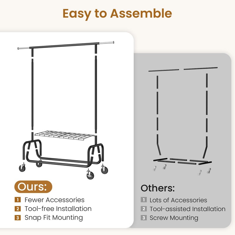 - 5-MINUTE TOOL-FREE INSTALLATION: The freestanding clothes racks adopts press installation, eliminating the tedious time of screwing, which will not damage the wall or floor, easy to dismantle when moving house, and can be quickly installed and used anytime and anywhere, perfectly adapts to flexibly meet your storage needs.