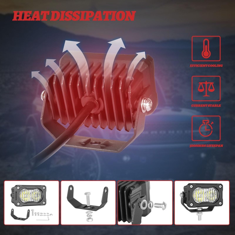 DEPENDABLE PERFORMANCE - These 3" off road led light with innovative advanced Integrated Thermal Management system, has increased surface area ensures heat generated during operation of the ditch lights is more efficiently dissipated away from the unit, keep it running at safe working temperature, the 3" led cube lights has lasting service lifespan to over 50,000 hours. The mounting brackets can be adjusted to change the light direction according to needs.