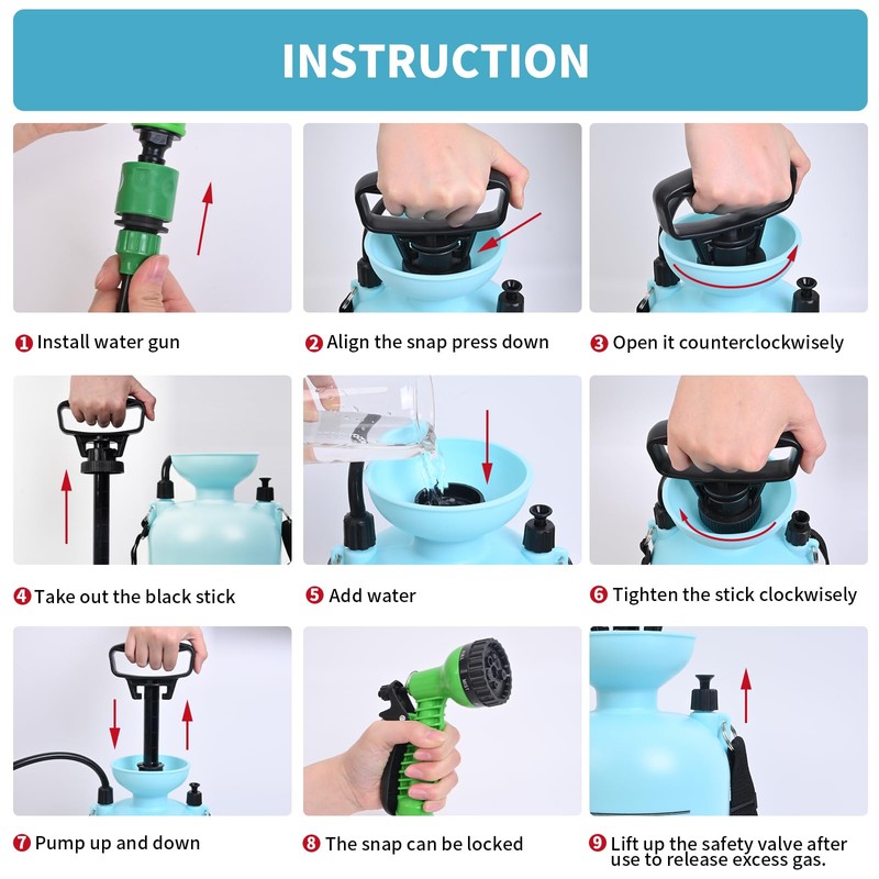- 【Working Principle】 Portable shower utilizes a sealed container to pressurize the air and pressurize the water out for showering (the amount of water can be adjusted by the switch on the shower nozzle). No electricity is needed, just fill the bucket with water and manually pump up the air to increase the pressure, and you can enjoy a shower anytime, anywhere.