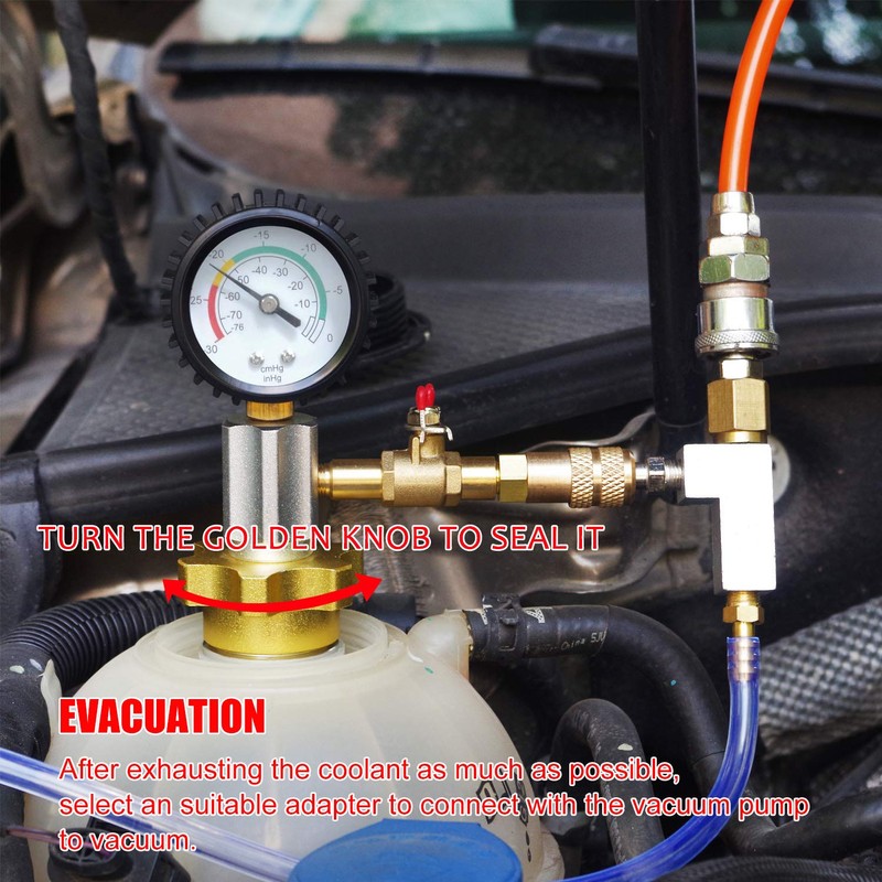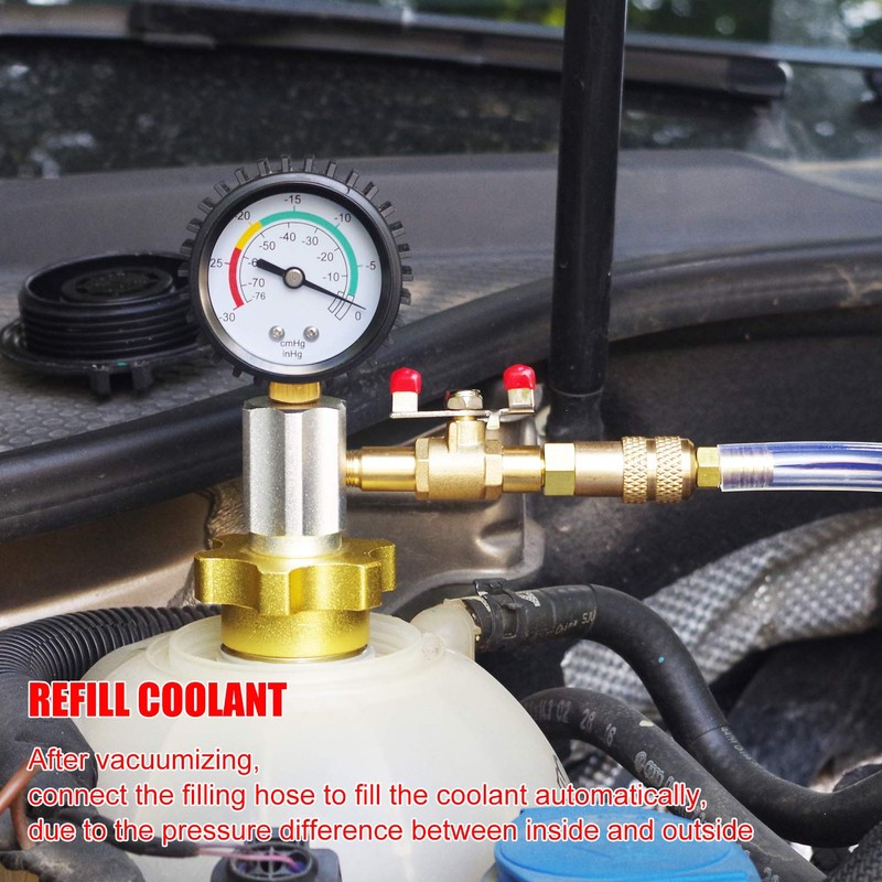 - Water Tank Coolant Vacuum Refill: Premium aluminum manifold body, equipped with brass fittings, anti-corrosion and durable. The index range of gauge is -30~0inHg (-76~0cmHg), and normally -25~-20inHg is right time to add coolant. Tee fittings is used for vacuumizing, and coolant filling hose for refilling coolant.