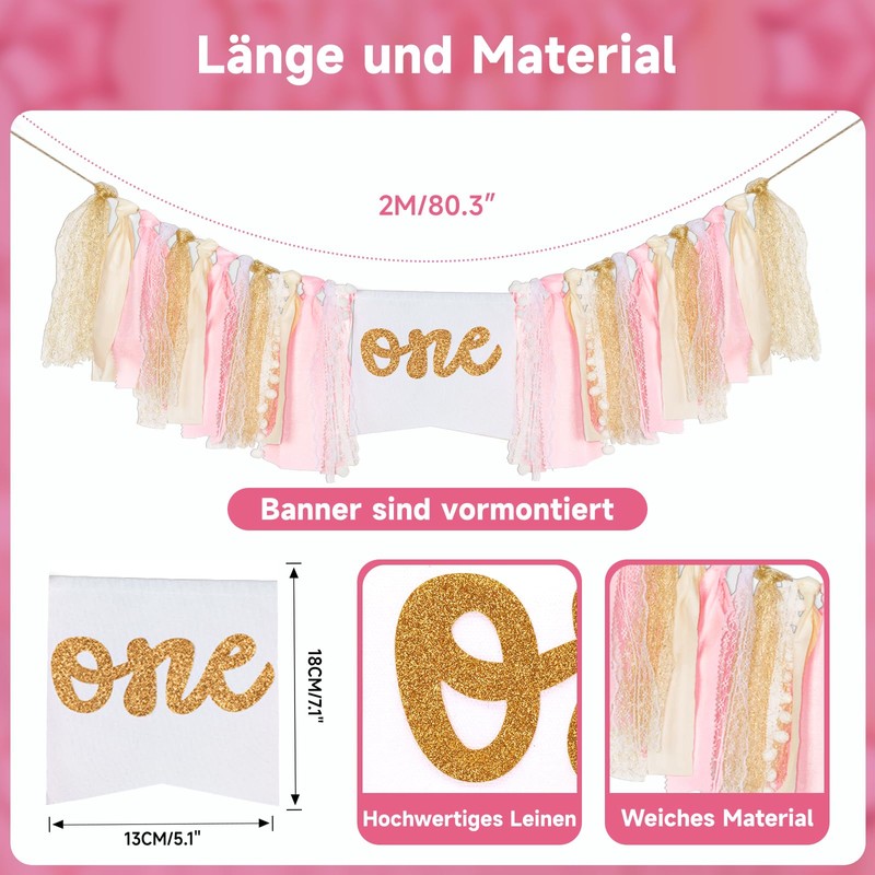 - Material and size: Our glitter 'One' themed banner is made of exquisite fabric, tulle material. Hessian "One" flag size is 17 x 21 cm. The pink high chair banner for the first birthday is pre-assembled and easy to use. All you need to do is hang the cord on both sides or attach to the high chair with self-adhesive double-sided tape. The distance of the strap can be easily adjusted and therefore fits all high chairs.