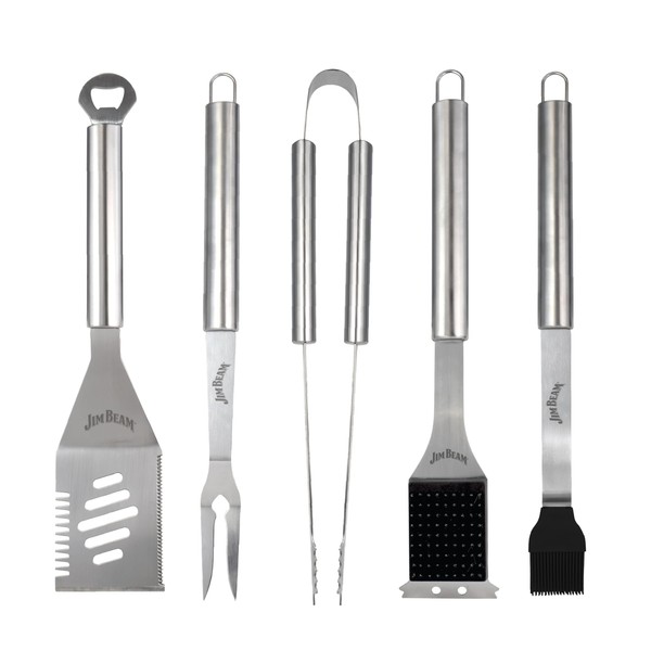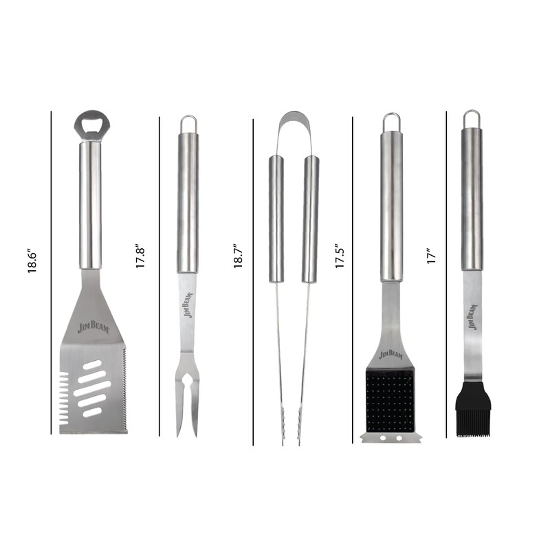 Jim Beam 5 Piece Stainless Steel Grilling Tool Set - Grill Brush, Tongs, Basting Brush, Fork, and 4 in 1 Spatula with Extra Long Handles