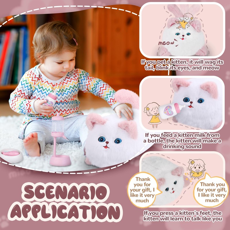 - Realistic Feeding Experience: When you feed the toy kitten for girls with the included bottle, the toy cats for kids aged 5-7 make a realistic sucking sound, creating a true-to-life feeding experience for young ones. This interactive kitty stuffed animal helps children learn responsibility and empathy for their new plush friend. The sucking sound feature makes playtime more immersive, bringing the nurturing experience to life.