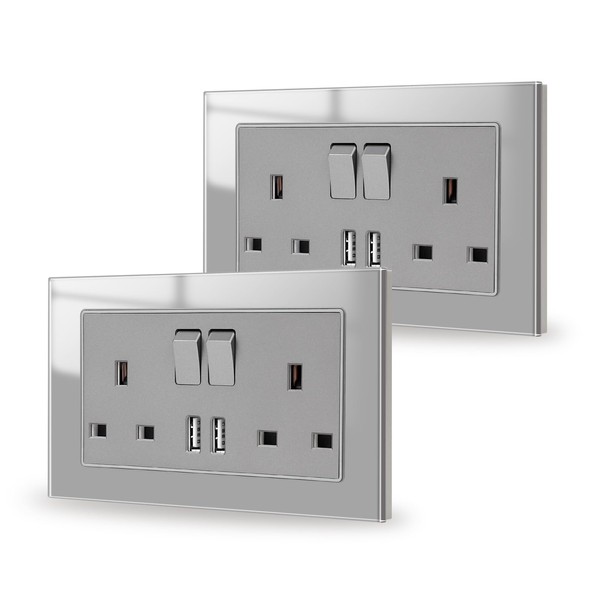 JIMEIDA Grey Double Switched Power Socket 2 Pack with USB A Charging Ports Crystal Glass Panel Wall Outlet 13 Amp Electric Socket