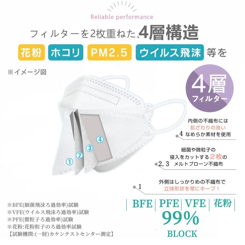 • Inspected in Japan: 99% PFE/BFE/VFE. Bacterial droplet filtration (BFE), Viral droplet filtration (VFE), and Pollen particle filtration (PFE) efficiency is over 99.9%This product has been tested for functionality so you can use it with confidence.