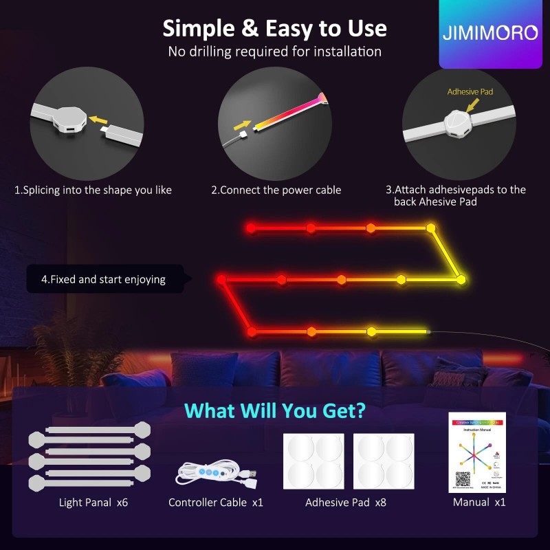 JIMIMORO 6 Pack Smart Wall Light Lines - Smart Home Decor Creative DIY RGB Lines with ...