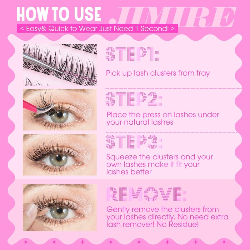 - Comfortable Wear, All-Day Long: Engineered with comfort in mind, the wispy lightweight cluster eyelash extensions provide a comfortable wearing experience from morning till night. The soft and flexible lash band coupled with the secure adhesive ensures you forget you're even wearing falsies, allowing you to focus on feeling confident and beautiful from jimire press on lash clusters