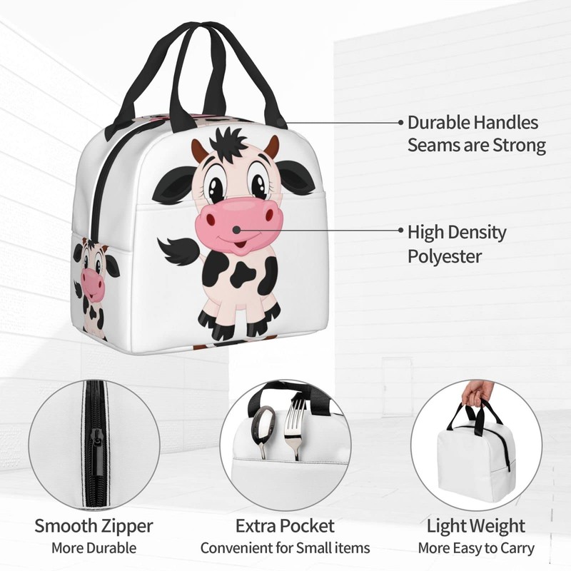 JIMOWANG Cute Cartoon Milk Cow Portable Lunch Bag Compact Tote Bag Reusable Lunch Box Container for School Office Work