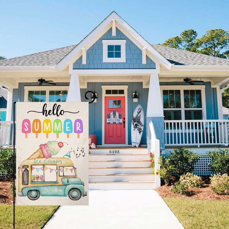 JIMOWANG Summer Ice Cream Garden Flag 12" x 18" Vertical Double Sided Hello Summer Truck Beach Outside Decor Burlap Yard Flag