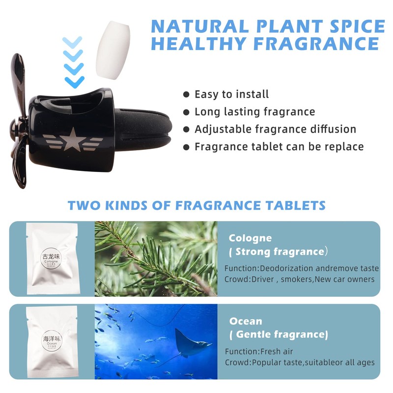 - ★NATURAL PLANT SPICES - There are 2 kinds of fragrances for the car fragrance air freshener for you to choose, Easy to replace,Safe to use and lasting fragrance, Cologne has the effect of deodorizing and remove taste, and is mainly suitable for new owners and smokers. Oceanic fragrances have a mild scent, purify the air and satisfy all tastes, and are suitable for all ages.