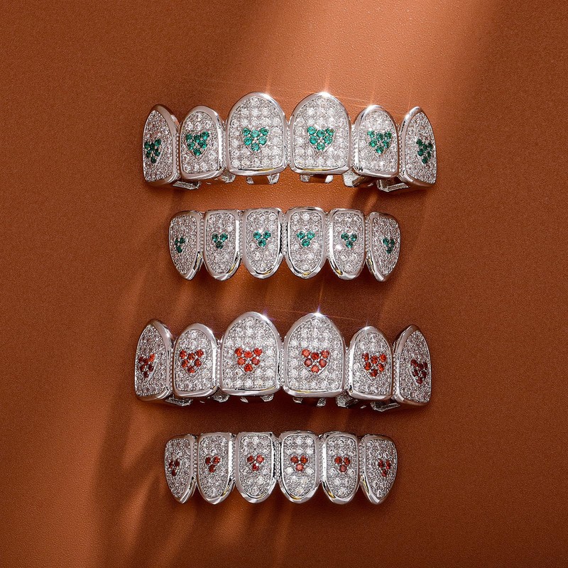- Red Diamond Heart Grillz: The silver mouth teeth grill adopts 18K Gold/Silver plated, premium brass metal material and lots of premium red 5A+ sparkly bling cubic zirconia, Lead and Nickel Free, Eco-friendly.