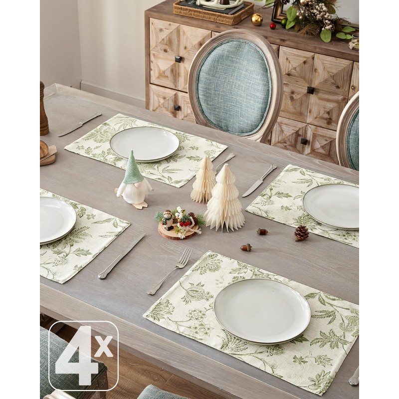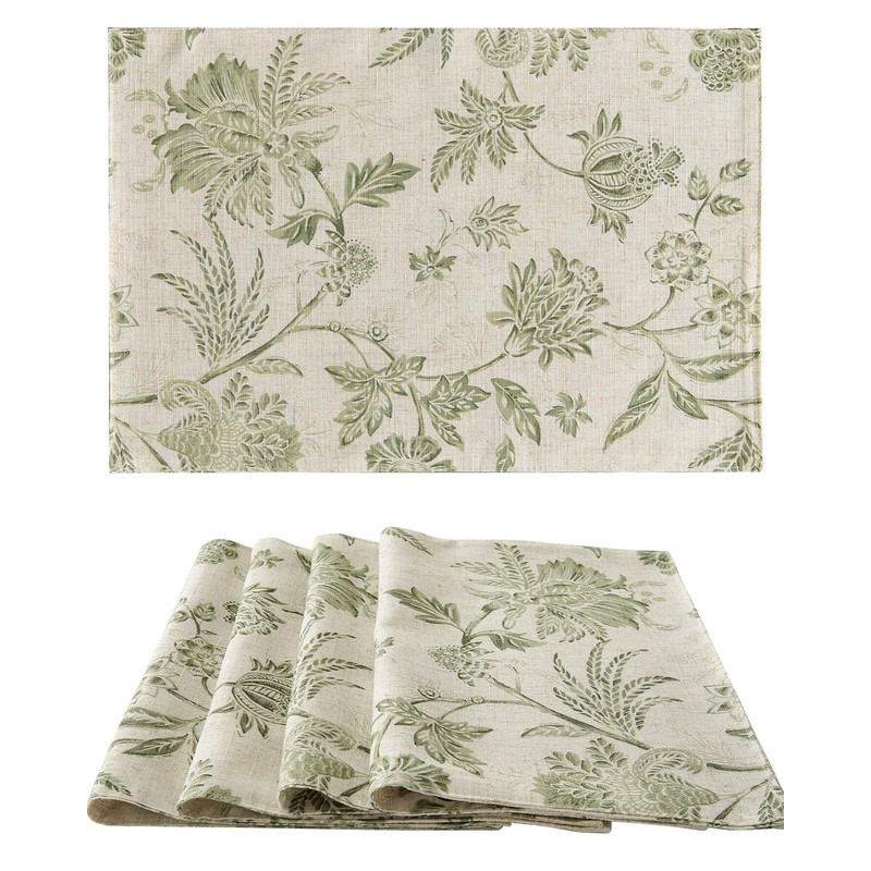 JINCHAN Floral Placemats Set of 4 Farmhouse Linen Placemats Cloth Table Mats Gray Leaf Printed Flax Cloth Rustic for Kitchen Dining Home Decor Holiday Washable Tablemats 13x19 Inch Green