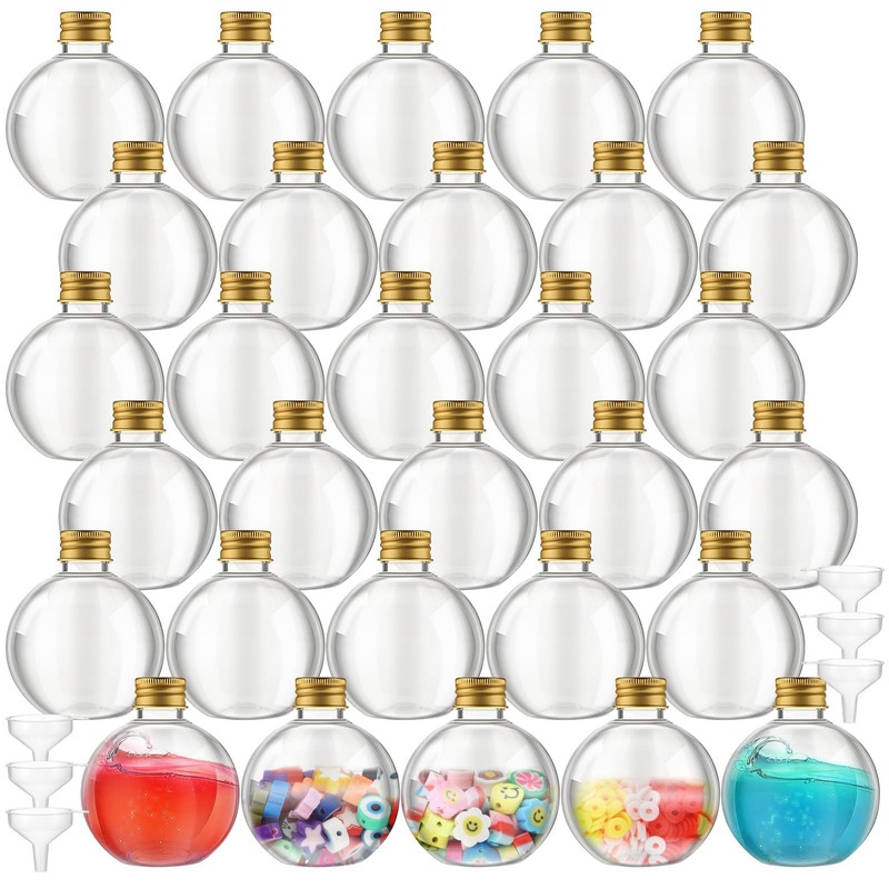 Jinei 30 Pcs 6 oz Ball Shape Plastic Sand Art Bottles Spherical Clear Plastic Potion Bottles Christmas Cocktail Ornament Balls for DIY Wedding Party Gift Crafts Decoration (Gold,Aluminum Cap)