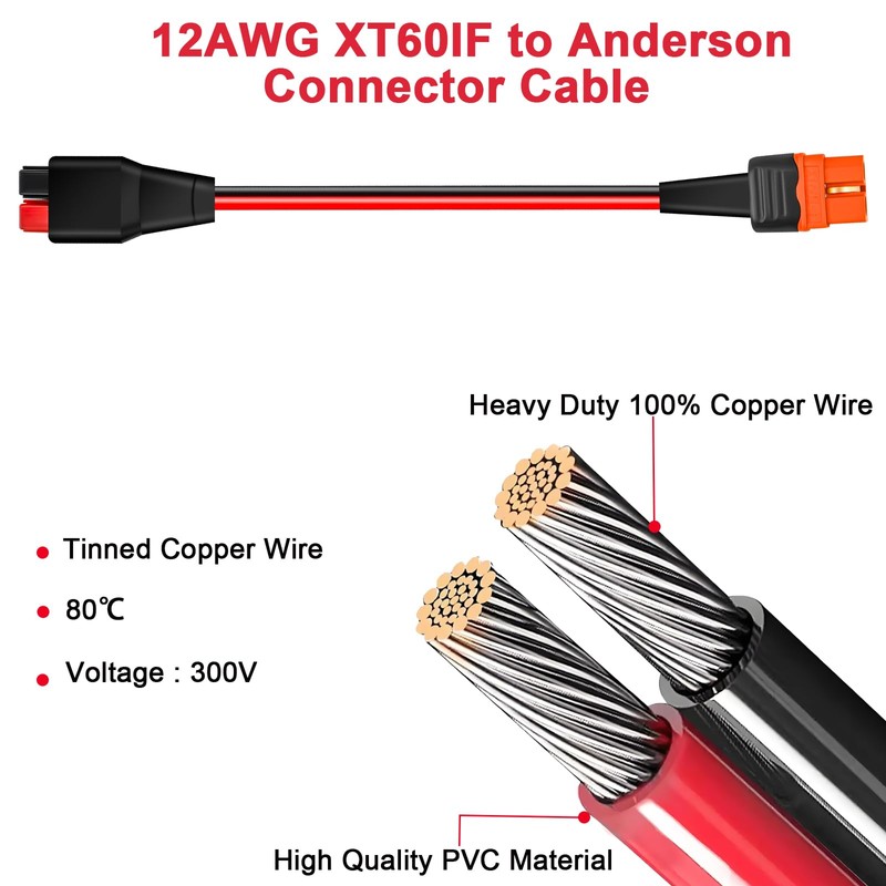 - Universal Compatibility – Easily connects XT60i-equipped RC batteries (drones, RC cars, etc.) to Anderson equipped devices, such as solar panels and portable power stations.