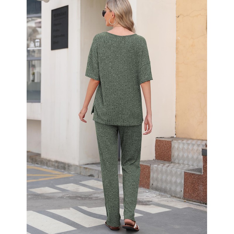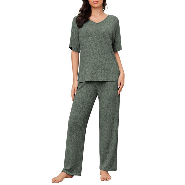 JiniGolla Ribbed Knit Pajamas Womens Short Sleeve Pjs 2 Piece Loungewear with Pockets Deep Green L