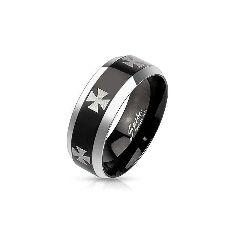 Jinique STR-0201 Laser Etched Iron Cross Stainless Steel Black IP Center Band Ring with Beveled Edge (14)