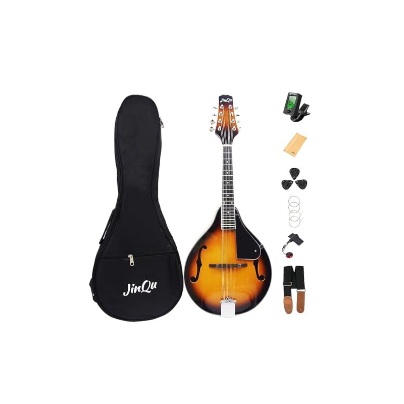 JinQu Model A mandolin instrument for beginners, children, adults; 8-string acoustic mandolin selection of spruce and Sabili; Starter kit: Tuner, strings, straps, pick, wipe cloth,Sunburst