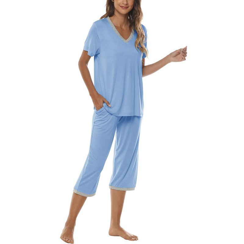 - Features:Women's capris pajama sets. V-neck short sleeve pajama top with elastic waistband solid color capri pant with two pockets.