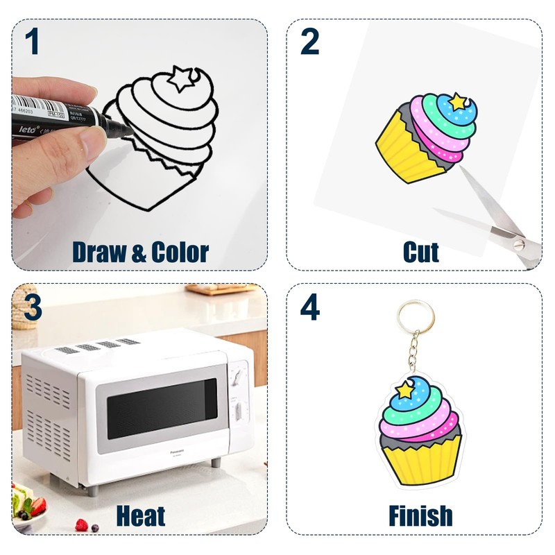 - How to use: Paint a pattern and a colour on the matte side of the shrink paper set, cut it with scissors and punch holes, place it in the oven or dry it with hot air, and press it quickly with a heavy object after removing it from the oven to make the uneven areas flat. It is recommended for children aged 5 and over, and adult supervision is required during baking.