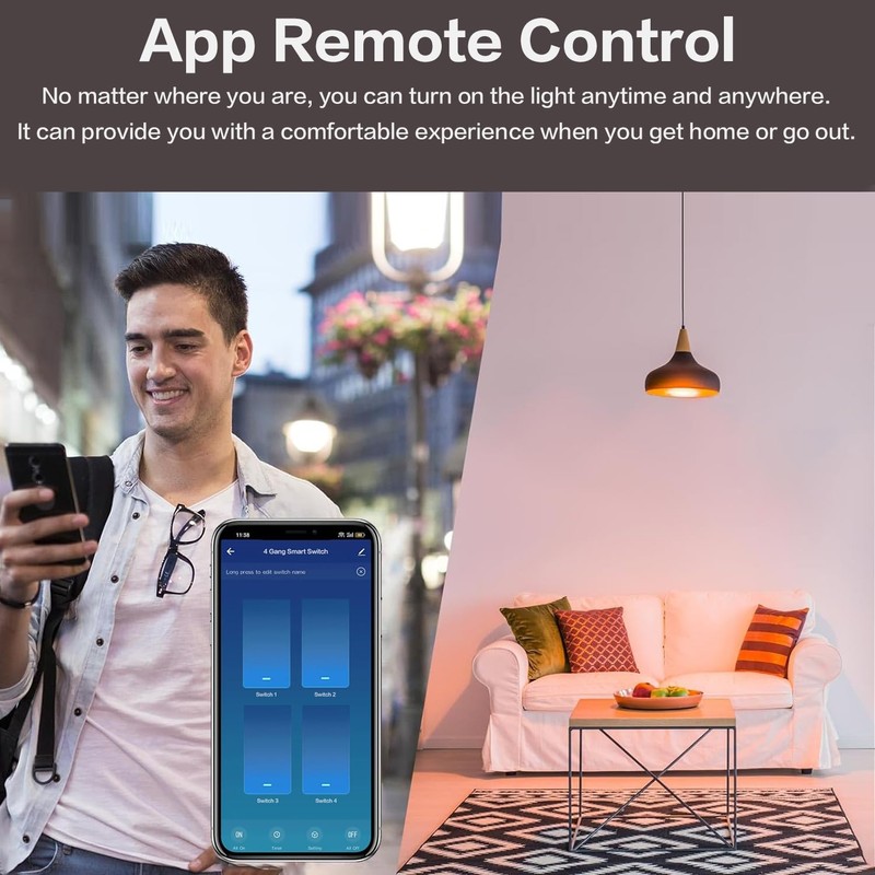 - APP Remote Control : The free Smart APP (Smart Life/Tuya) can control the smart light switch through your smartphone (iOS/Android). Whether lying comfortably in bed, in the office, or on vacation, you can control the WiFi light switch anytime, anywhere through the APP on your smartphone. Never worry about forgetting to turn off the WiFi light switch again.