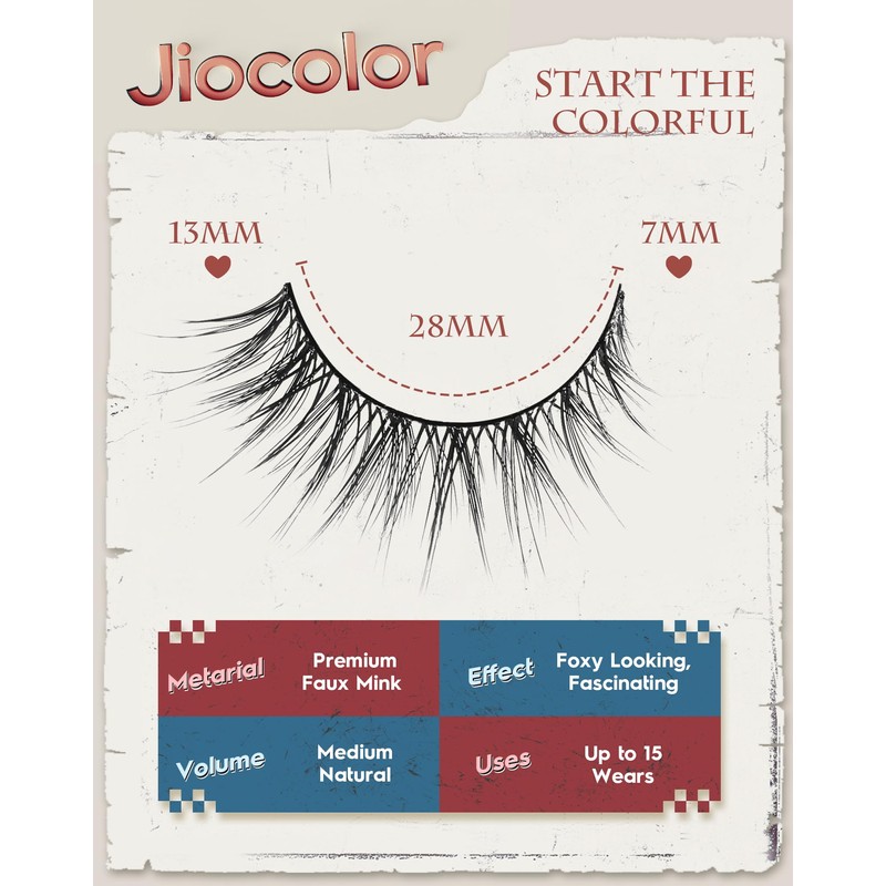 - I'm so natural: Jiocolor natural eyelashes give the effect of an amazing lash lift. Perfect for those who have super short natural lashes and want to add a touch of length & volume. Sitting on a cotton band that blends seamlessly with your natural lash line for a discreet look.