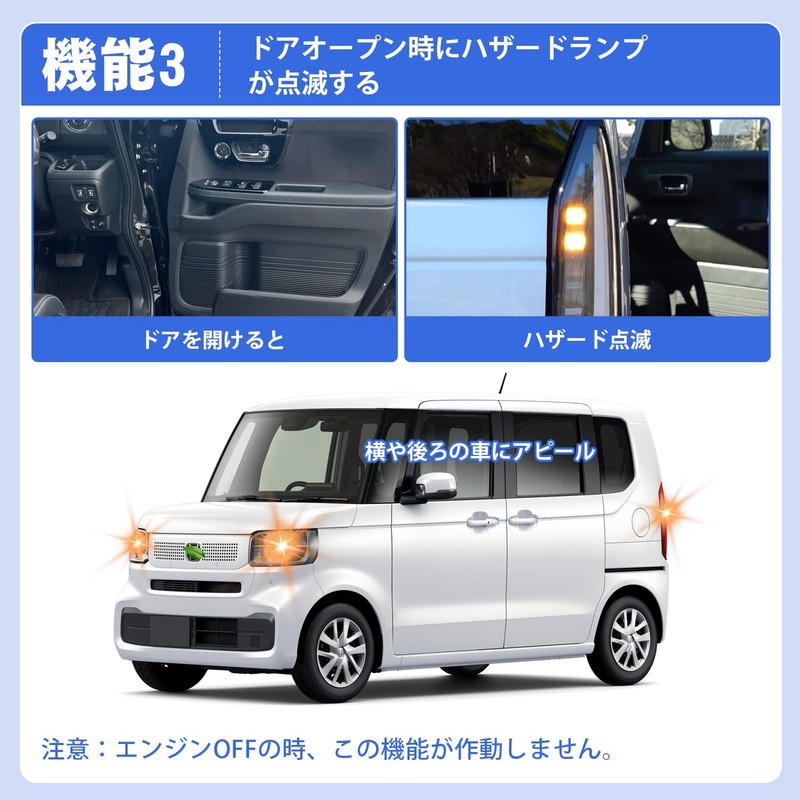 - 4 Convenient Functions: The NBOX JF5 Interlocking Speed Door Lock features (1) Auto Door Lock when travelling: Automatic door lock at 15 km/h or D shift. 2. Unlock door when parked: The door lock will automatically be unlocked with P shift or engine off. 3. Flashing hazard light when door is opened: The hazard will flash when the door is opened, so you can alert you to the next vehicle. 4. Flashing hazard light when reversed: The hazard flashes in conjunction with the R shift, enhancing rear safety