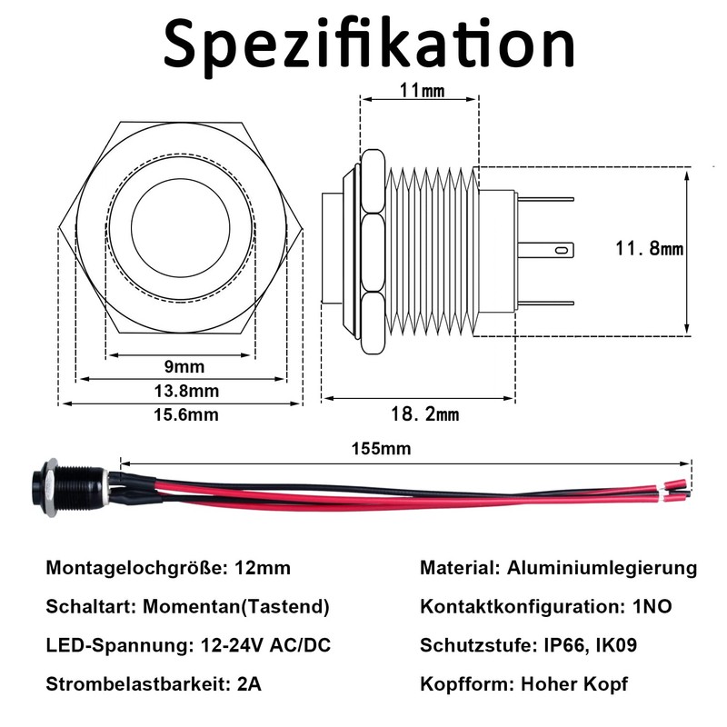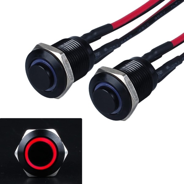 JIQI 2 x 12 mm Momentary Pressure Switch 12 V to 24 V 2 A Waterproof Button Switch Made of Metal IP66 1NO Current Black Push Button with LED Light Connection Wires for Motorcycle (High Head, Red)