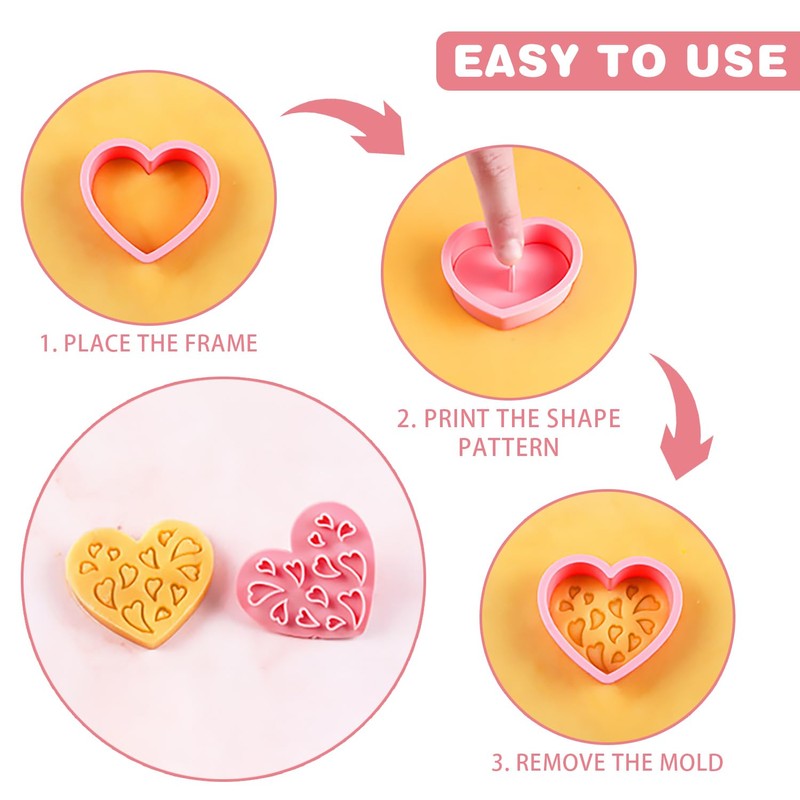 - Easy to Use: These heart shaped cookie cutters with plunger stamps feature a 3D printable design that allows you to cut shapes and stamp patterns quickly and easily. Just three simple steps: 1. Use the outer frame mold to cut shapes. 2. Place into the inner frame mold and press. 3. Remove the mold and you're done. Easy to operate and no fail even for kids!