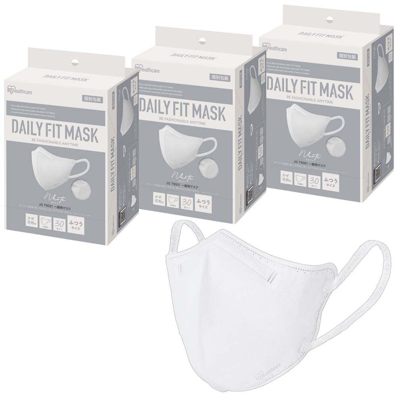 [アイリスオーヤマ] JIS規格適合品 マスク 90枚 不織布 立体マスク 個包装 カラーマスク デイリーフィットマスク ふつうサイズ 血色マスク 秋用マスク チーク 3Dマスク 30枚入りx3 RK-F30SW ホワイト